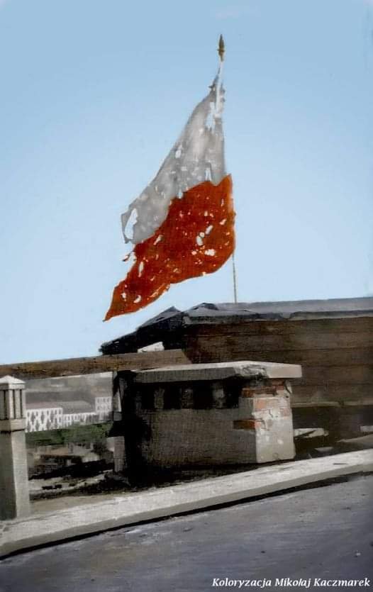 Flaga z przestrzelinami na Dworcu Pocztowym przy ulicy Żelaznej miedzy ulicą Chmielną a Alejami Jerozolimskimi, w ostatnich dniach Powstania Warszawskiego